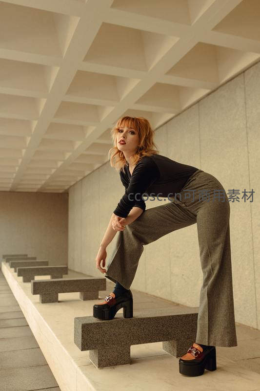 红发女性在几何线条分明的现代建筑中摆出动态姿势,黑色上衣搭配阔腿裤与厚底鞋,凸显个性与力量感,充满视觉冲击力。