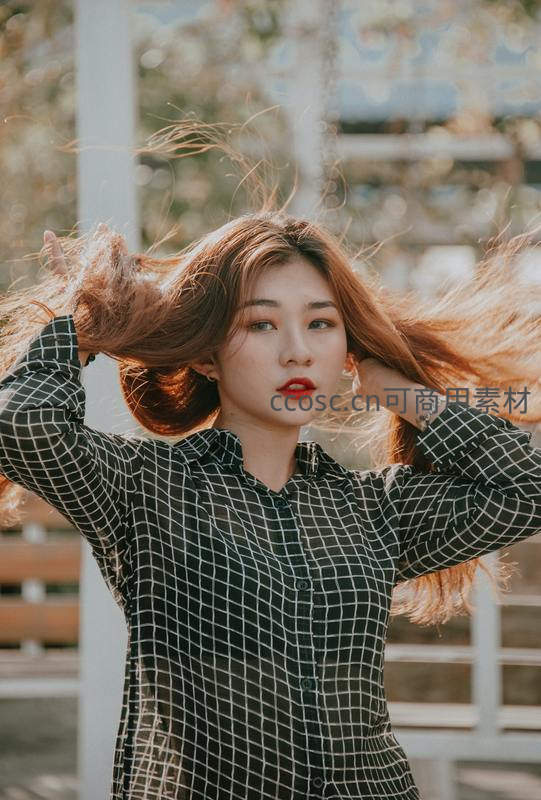 一位年轻女性在户外阳光下,身穿黑白格子衬衫,双手撩起被风吹动的秀发,神情自信而惬意,背景虚化营造出温暖柔和的氛围。