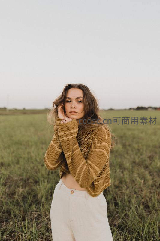 女子身穿条纹针织上衣与白色阔腿裤,伫立于广阔草地中,微风轻拂发丝,眼神宁静,尽显自然与人文交融之美。