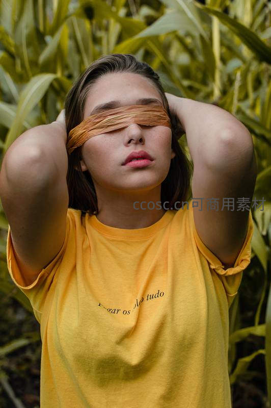 少女站在茂密玉米田中,以布条蒙住双眼,双手轻抚头部,神情平静安详,黄色T恤与绿色植物形成鲜明对比,传递自然中的冥想与沉思。