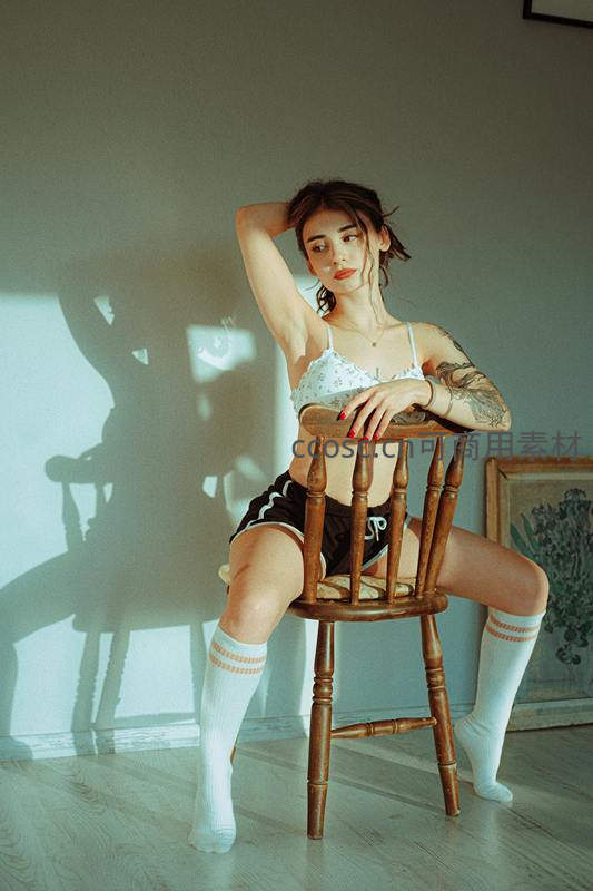 一位拥有精致纹身的年轻女子,在柔和的午后阳光下慵懒地倚靠在木椅上,神情放松,营造出宁静而富有艺术感的居家氛围。