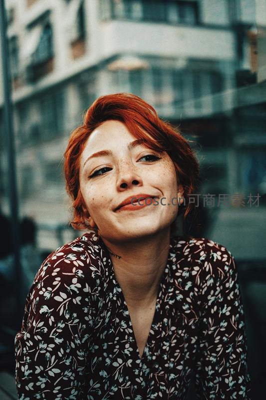 一位红发女孩在城市街头微微仰头,脸上带着自信而温暖的笑容,背景是模糊的城市建筑,展现出一种随性又迷人的都市女性气质。