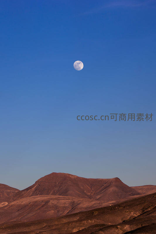 在晴朗的白昼,一轮清晰的月亮高悬于湛蓝天空,俯瞰着广袤而荒凉的棕色山丘地貌。