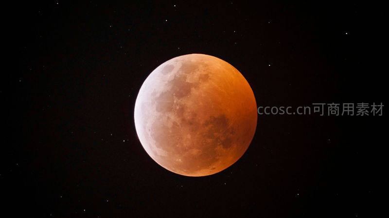 一轮巨大的血红色满月在漆黑的夜空中闪耀,其表面细节清晰可见,周围点缀着点点繁星,营造出神秘而壮观的天文景象。