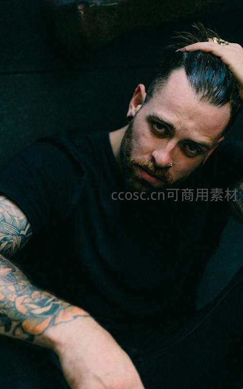 在昏暗的背景下,一位纹身男子低头凝视,手抚发梢,面部光影对比强烈,突显其深邃眼神与不羁气质,充满艺术感。
