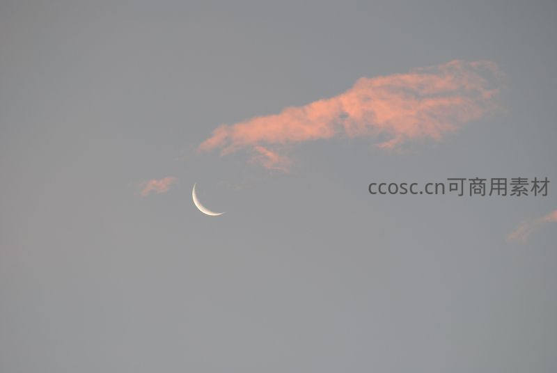 一弯纤细的新月悬于淡灰色天空,身旁飘过一抹被夕阳染成粉橙色的云彩,整个画面散发着宁静、温柔与浪漫的气息。