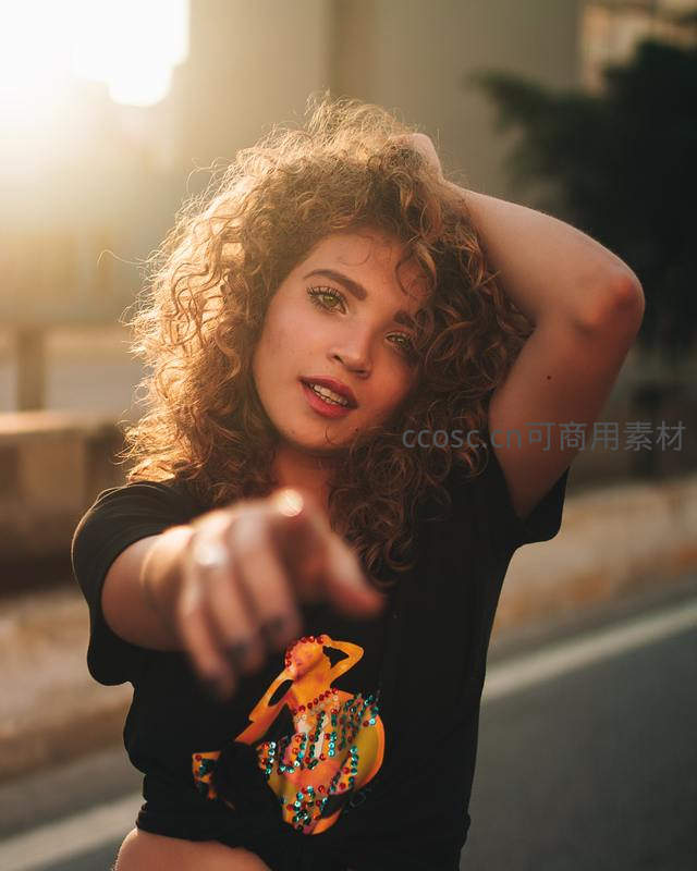 在夕阳余晖中,一位卷发女孩身穿印有亮片图案的黑色T恤,手指直指镜头,表情自信张扬,充满都市青春与个性张力。