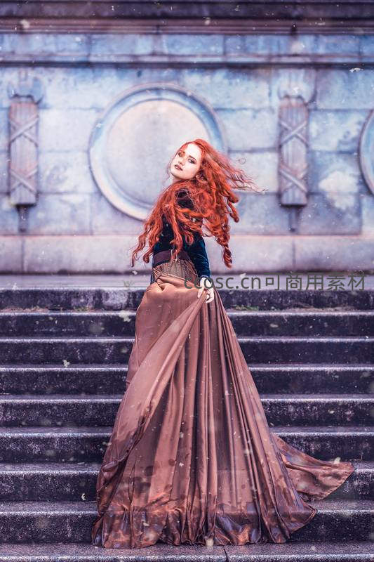 一位红发女子身着华丽棕色长裙,伫立在石阶之上,雪花纷飞中回眸凝望,背景是古典建筑,尽显高贵典雅与冬日浪漫。