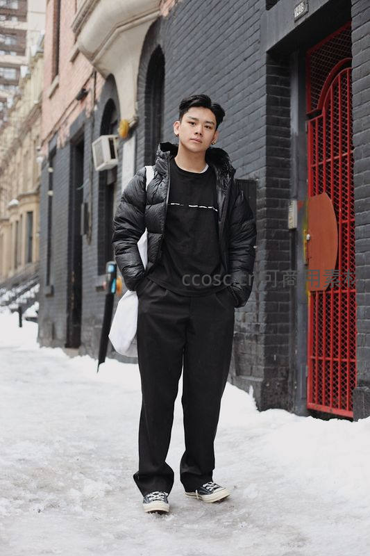 青年男子站在积雪覆盖的城市街巷中,身穿黑色羽绒服与运动裤,手插口袋,背景砖墙与红色铁门形成鲜明对比。