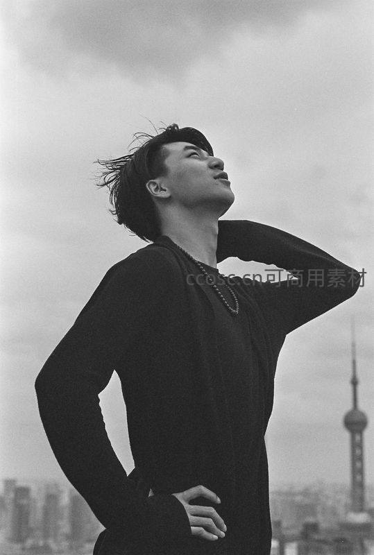 一位年轻男子在城市高楼之上仰望天空,背景是标志性的东方明珠塔,展现出都市生活的自由与向往。