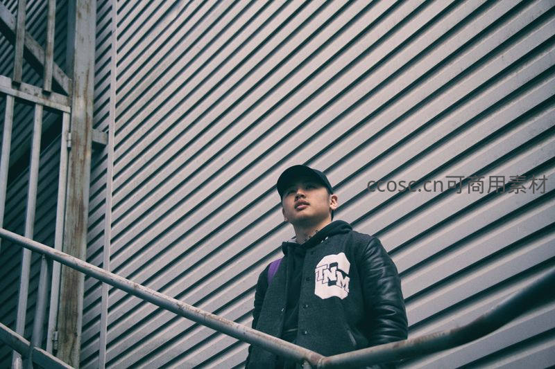 街头青年倚靠栏杆,工业风背景显酷感
