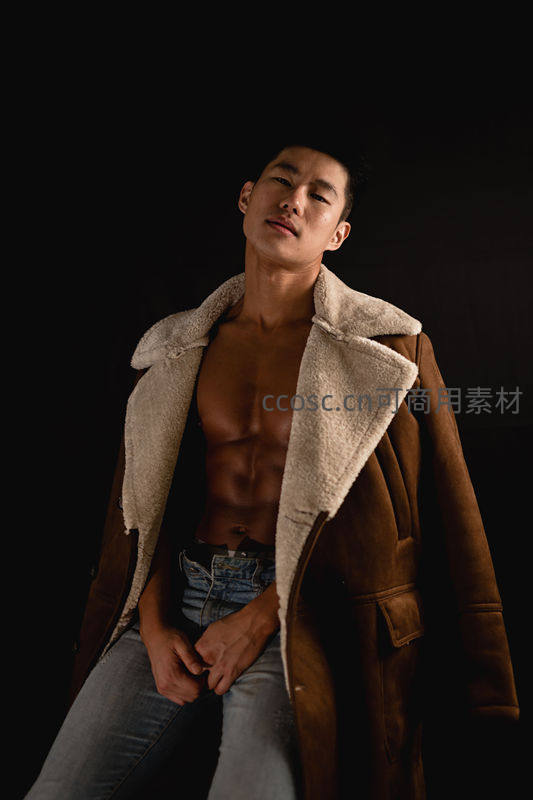 一位身材健硕的男子敞开棕色皮草外套,露出结实腹肌,搭配浅色牛仔裤,在纯黑背景下展现出强烈的视觉冲击力与时尚感。