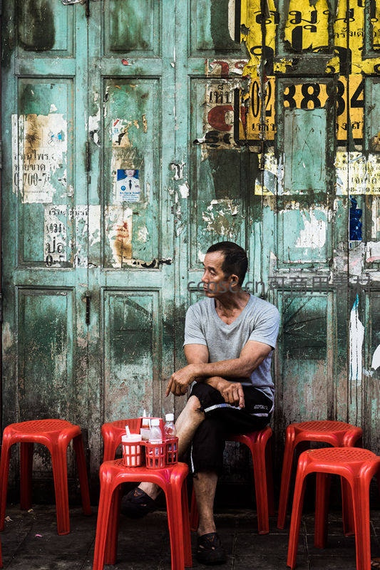 一位中年男子坐在斑驳的绿色木门前,身旁是几把鲜红的塑料凳,墙上贴满褪色海报,展现浓郁的市井生活气息与时光印记。