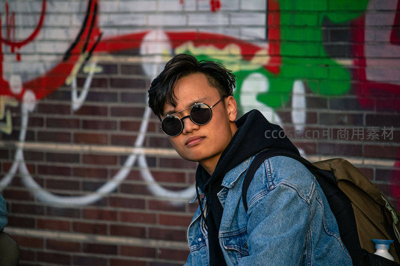 年轻男子身着牛仔夹克背着背包,戴着圆形墨镜在色彩斑斓的涂鸦墙前摆拍,展现出个性鲜明的街头潮流风格和自信姿态。