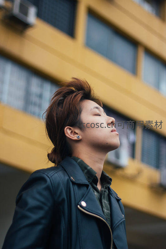 一位染发少年身穿黑色皮衣,闭目仰头沐浴在阳光下,身后是明亮的黄色建筑外墙,传递出宁静、沉思与都市青春的氛围。