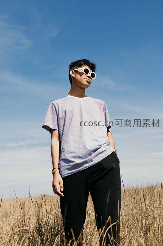 麦田少年仰望蓝天,时尚墨镜点缀自然风光