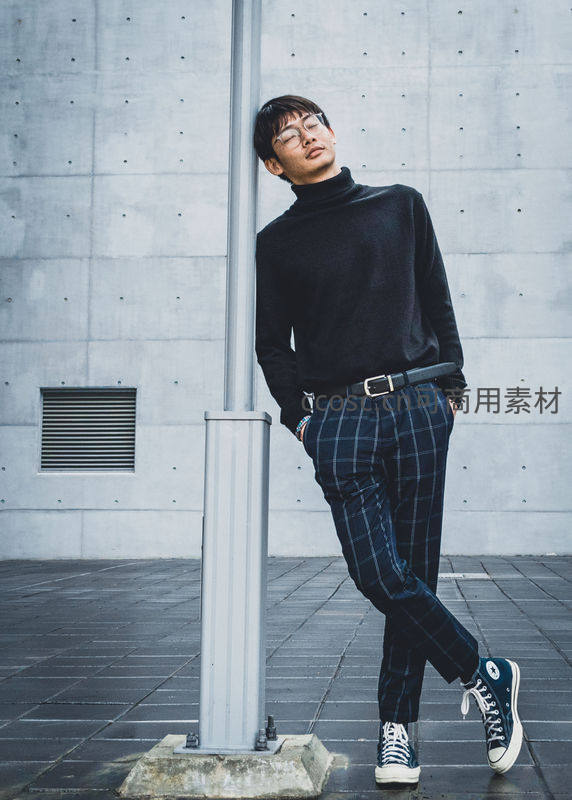 一位戴眼镜的年轻男子身着黑色高领毛衣和蓝格纹长裤,倚靠在现代感十足的灰色水泥墙边的灯柱上,姿态慵懒而充满时尚气息。