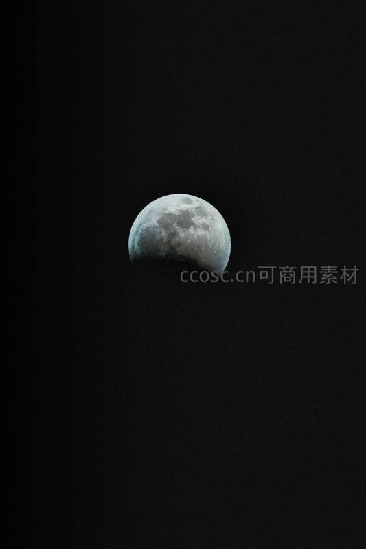 在漆黑的夜幕背景下,月亮正处于半影月食阶段,其表面被一层柔和的灰色阴影覆盖,呈现出独特的残月形态。