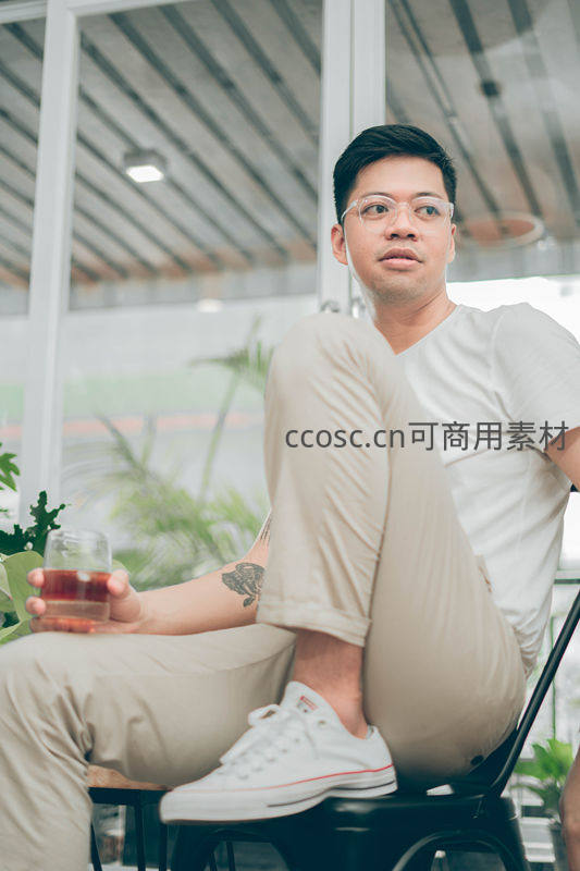 一位戴眼镜的年轻男子在明亮的咖啡馆内,手持一杯饮品,姿态放松,享受悠闲的午后时光,背景绿植点缀,氛围舒适惬意。