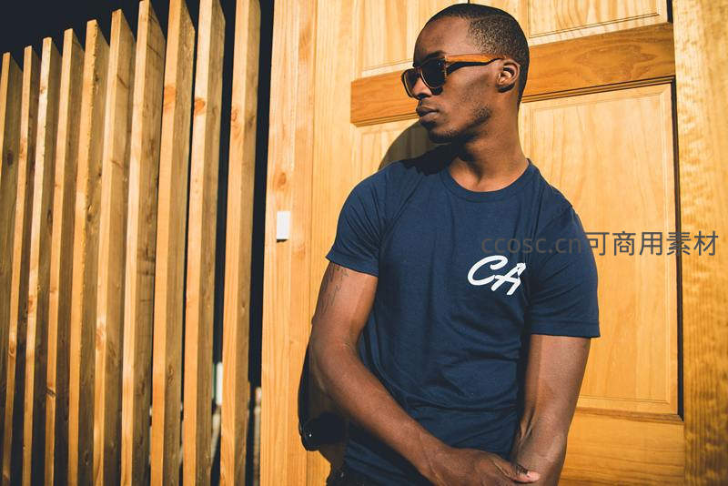 一位肤色健康的男士佩戴时尚墨镜,身穿印有字母的深蓝色T恤,倚靠在温暖木质墙板前,阳光洒落,彰显现代都市男性的自信与型格。