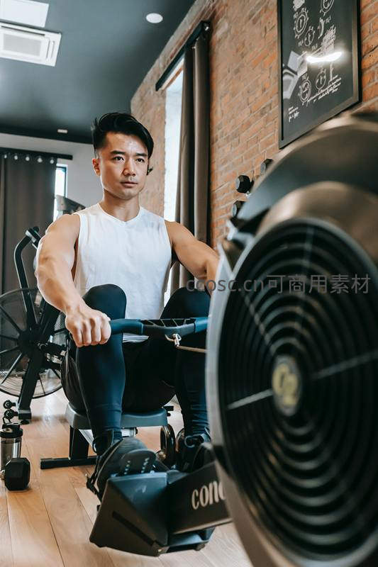 男子在健身房内使用风阻式划船机进行有氧与力量结合训练,眼神专注,肌肉紧绷,体现高效燃脂与体能提升的科学锻炼场景。