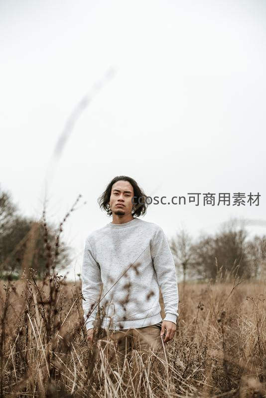 一位长发男子伫立在枯黄的野草丛中,神情宁静而深邃。背景是灰白的天空和稀疏的树木,营造出一种孤独而自由的氛围。