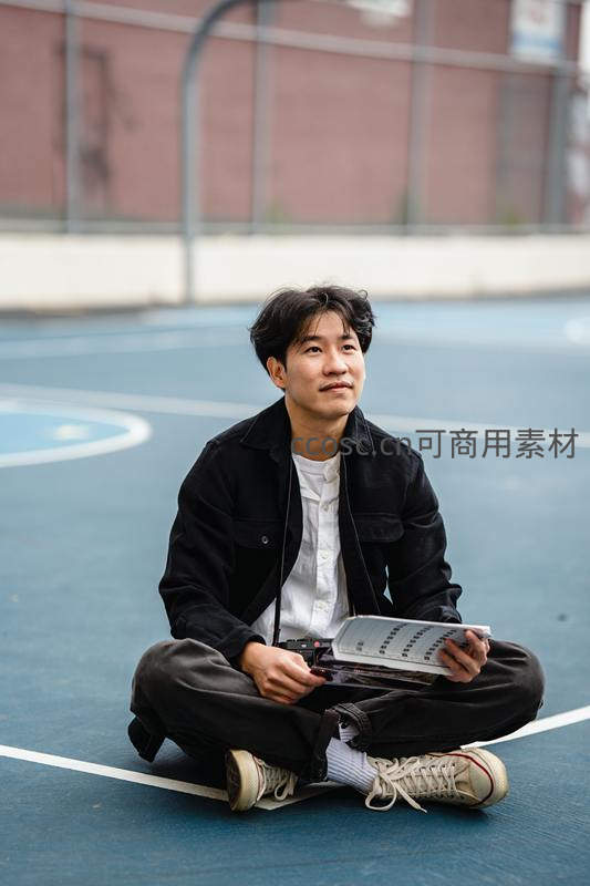 一名青年坐在蓝白相间的室外篮球场上,盘腿坐着使用笔记本电脑,神情轻松愉悦,展现了现代年轻人休闲与学习结合的生活方式。