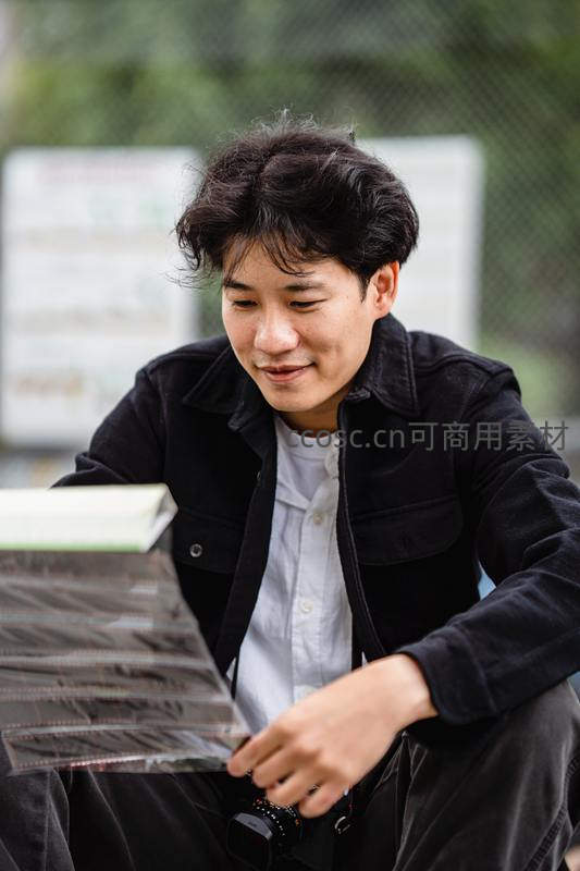 一位年轻的摄影师坐在户外,微笑着仔细整理手中的胶片底片,身旁放着相机,背景模糊绿意盎然,充满文艺与怀旧气息。