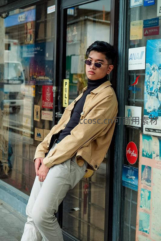 一位戴着墨镜、穿着卡其色夹克的青年倚靠在贴满航空公司贴纸的玻璃橱窗旁,姿态放松,展现都市街头的时尚与自由气息。