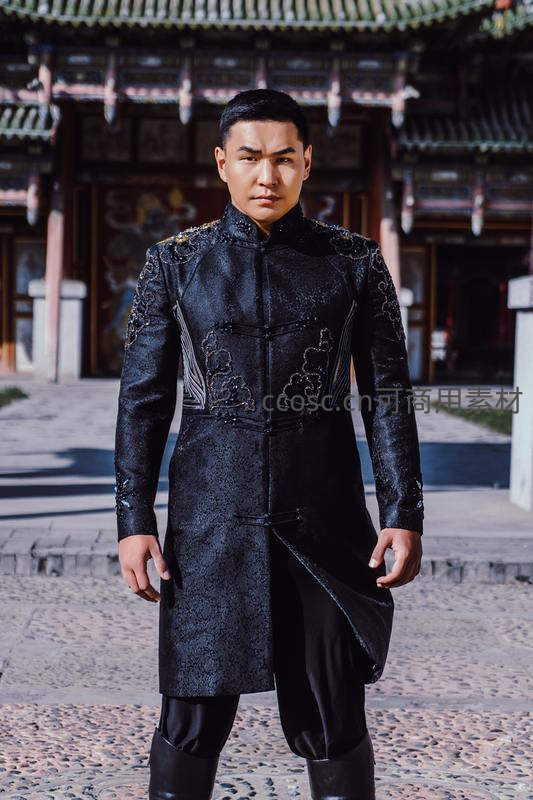 一位身着精致黑色刺绣长袍的男子,站立在古典宫殿前,背景是飞檐斗拱的传统建筑,展现出浓郁的历史与文化氛围。