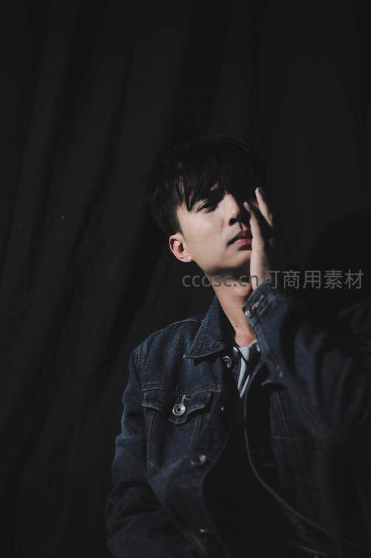 青年男子身穿牛仔夹克,在纯黑背景下以侧脸姿态展现,柔和光线勾勒轮廓,营造出沉静而富有情绪的艺术氛围。
