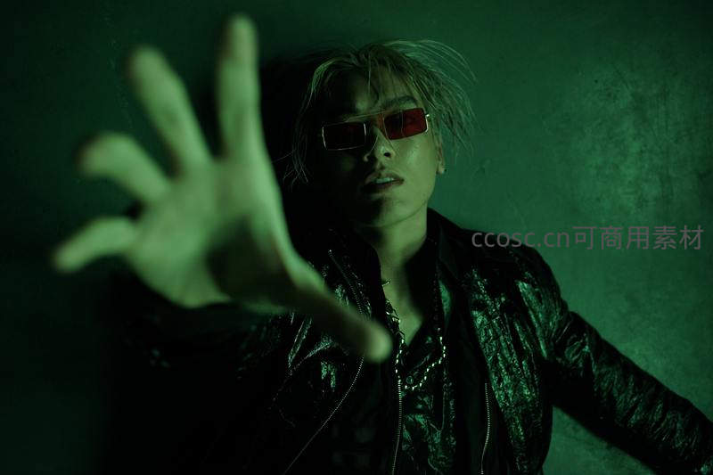 在绿色冷光笼罩下,青年佩戴红色墨镜、身穿皮夹克,伸手向前仿佛要抓住镜头,充满未来感和街头潮流风格。