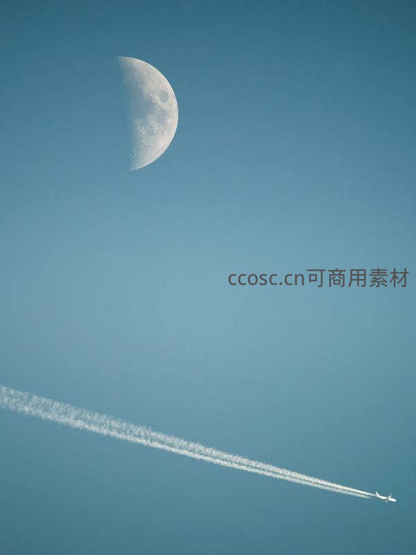 一弯清晰的半月高挂于澄澈的蓝天下,一架飞机拖着长长的白色尾迹从画面下方飞过,动静结合,充满现代感与诗意。