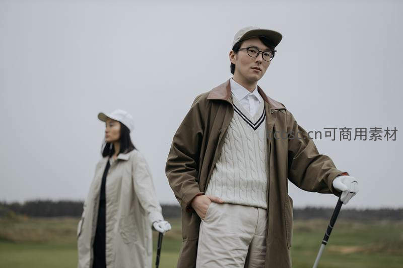 一对穿着时尚的情侣在开阔的高尔夫球场上,男士手持球杆目光坚定,女士在后方相伴,展现优雅的运动休闲时光。