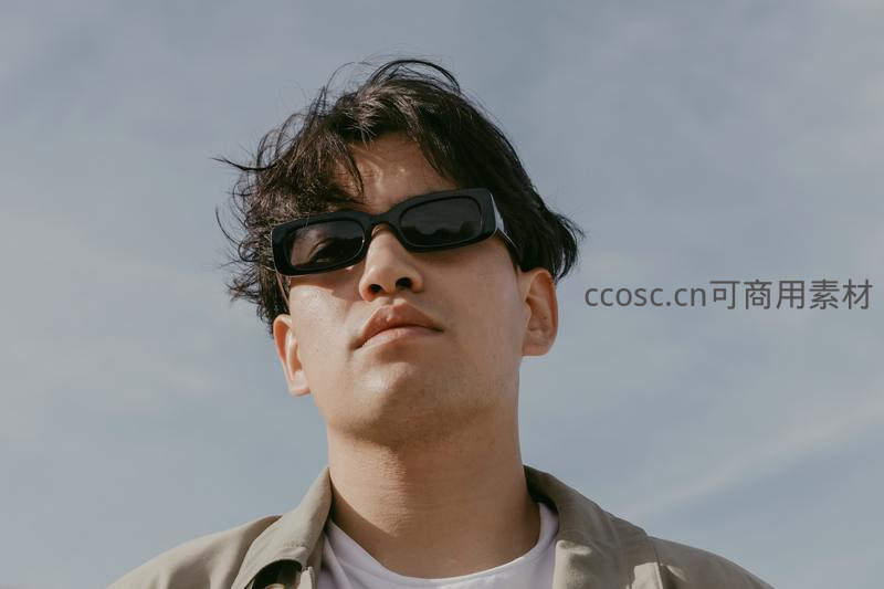 一位年轻男子戴着黑色墨镜,仰头望向晴朗天空,神情自信从容,微风轻拂发丝,展现都市青年的休闲与时尚感。