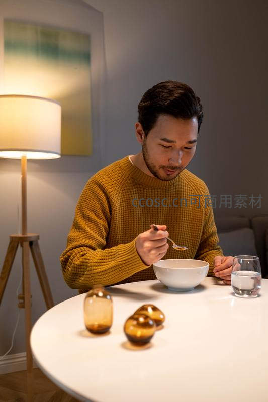 男子身穿黄色毛衣,在柔和台灯下安静享用早餐,桌上摆设精致,氛围温暖宁静,体现现代人追求的生活仪式感。