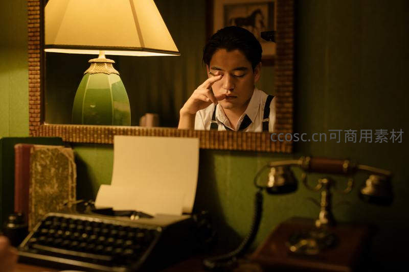 深夜写作的男子略显疲惫,轻揉双眼继续创作,桌上老式打字机与电话见证时光流逝,暖光下尽显文艺与坚持的动人瞬间。