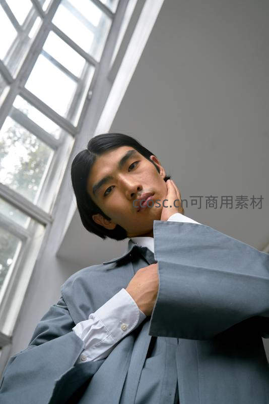 男子在明亮窗边整理衣领,柔和光线勾勒其轮廓,展现都市精英的从容与优雅,背景玻璃窗增添通透感。