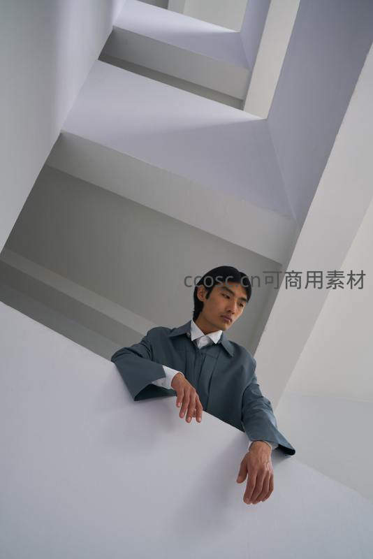 男子倚靠在纯白螺旋楼梯上,目光直视镜头,简洁线条与冷色系营造出冷静、前卫的视觉张力。