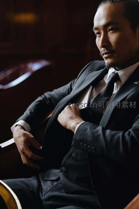 一位穿着深色西装、打着领带的男士,坐在椅子上,一手轻搭在西装上,姿态从容,眼神坚定,散发着专业与自信的气场。