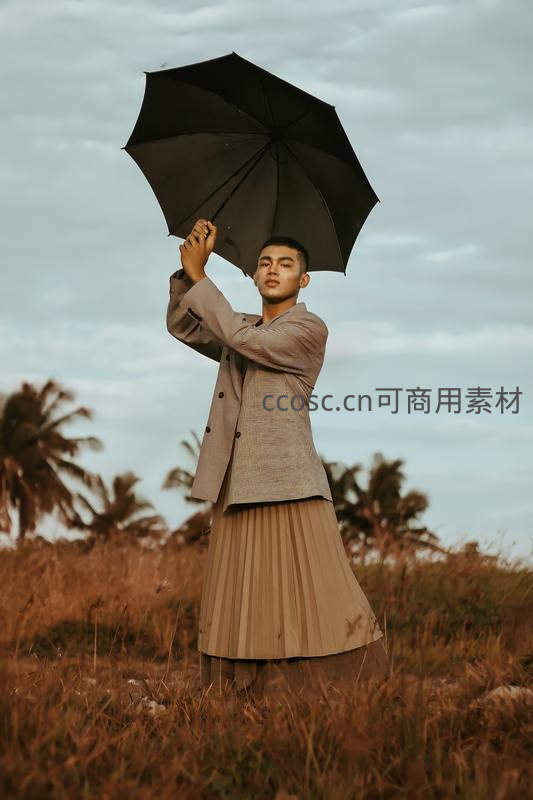 一名身着米色西装与长裙的男子站在金黄草地上,高举黑色雨伞仰望阴云密布的天空,棕榈树点缀背景,充满艺术感与戏剧性。