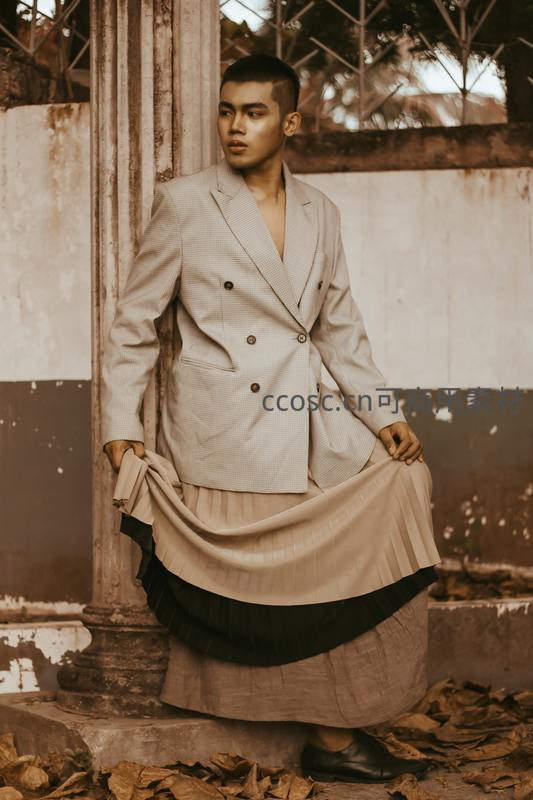 男子倚靠斑驳石柱,身穿浅色双排扣西装搭配多层次长裙,脚踩皮鞋,周围落叶纷飞,展现融合古典与现代的独特时尚风格。