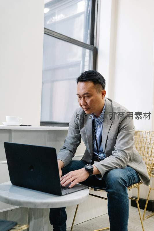 一位穿着灰色西装外套和牛仔裤的商务男士,在明亮的咖啡厅内坐在金色椅子上,专注地操作着黑色笔记本电脑,身旁摆放着咖啡杯。