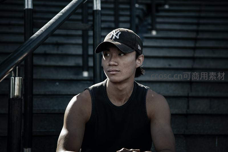 一名身穿黑色背心、头戴NY标志棒球帽的青年,坐在深色金属台阶旁,目光坚定地望向远方,展现出沉静与专注的运动型男气质。