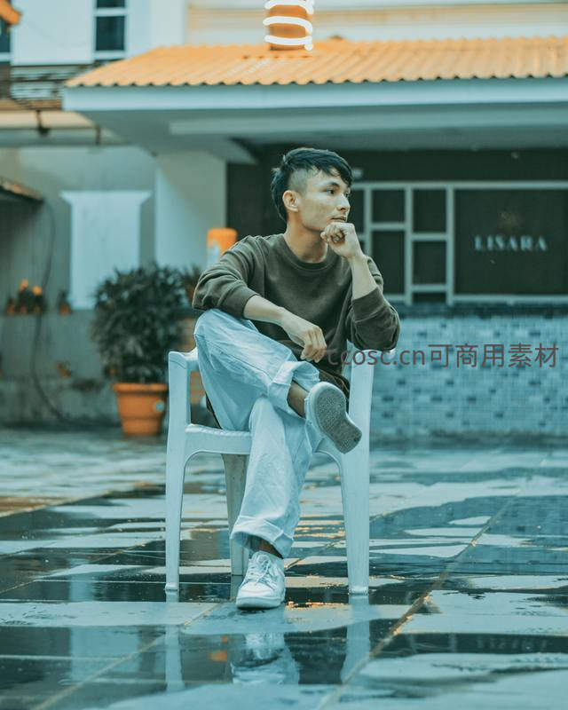 一位年轻男子坐在白色塑料椅上,手托下巴凝视远方,背景是雨后湿润的庭院与橙色屋顶,氛围宁静而略带忧郁。