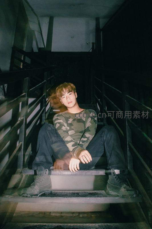 迷彩青年静坐楼梯间光影交错