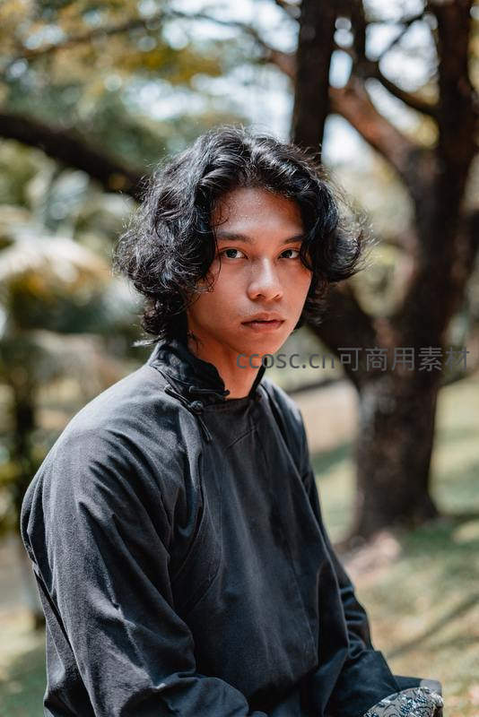 在阳光斑驳的树林中,一位留着蓬松卷发的青年身着黑色中式立领上衣,侧身回眸凝视镜头,神情沉静而富有故事感,背景是虚化的树木与光影。