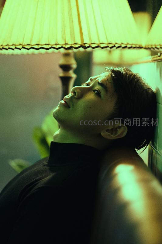 在柔和的绿色台灯光线下,一名男子倚靠沙发仰头凝视,神情宁静而深邃,营造出温馨又略带忧郁的氛围。