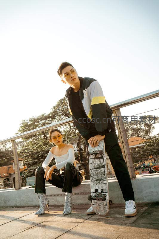 一对年轻情侣在城市天台拍摄时尚写真,男生手持滑板,女生优雅蹲坐,阳光洒落,背景绿树与建筑相映成趣,尽显青春活力与都市格调。
