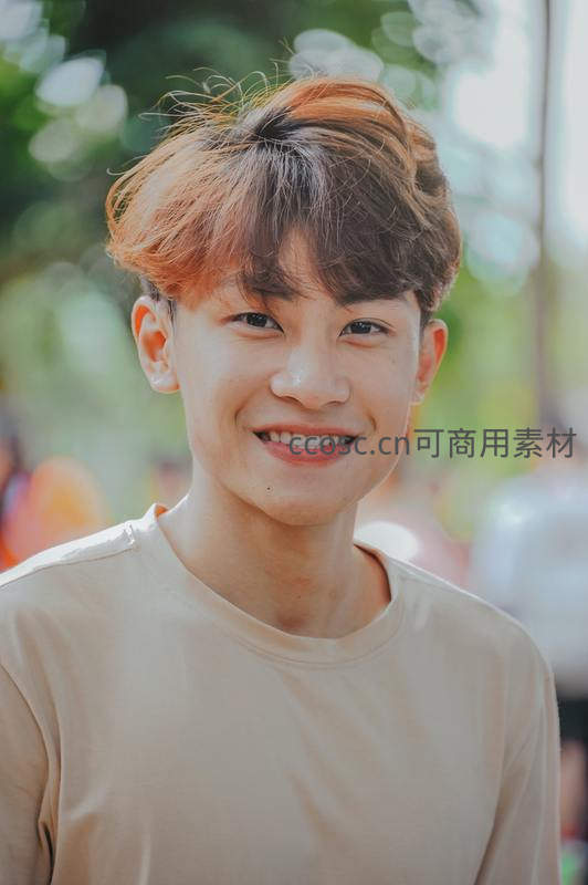 在柔和的自然光下,一位染着橙色头发的青年露出真诚灿烂的笑容,背景绿意盎然,整体画面明亮温馨,传递出积极乐观、阳光治愈的情绪能量。